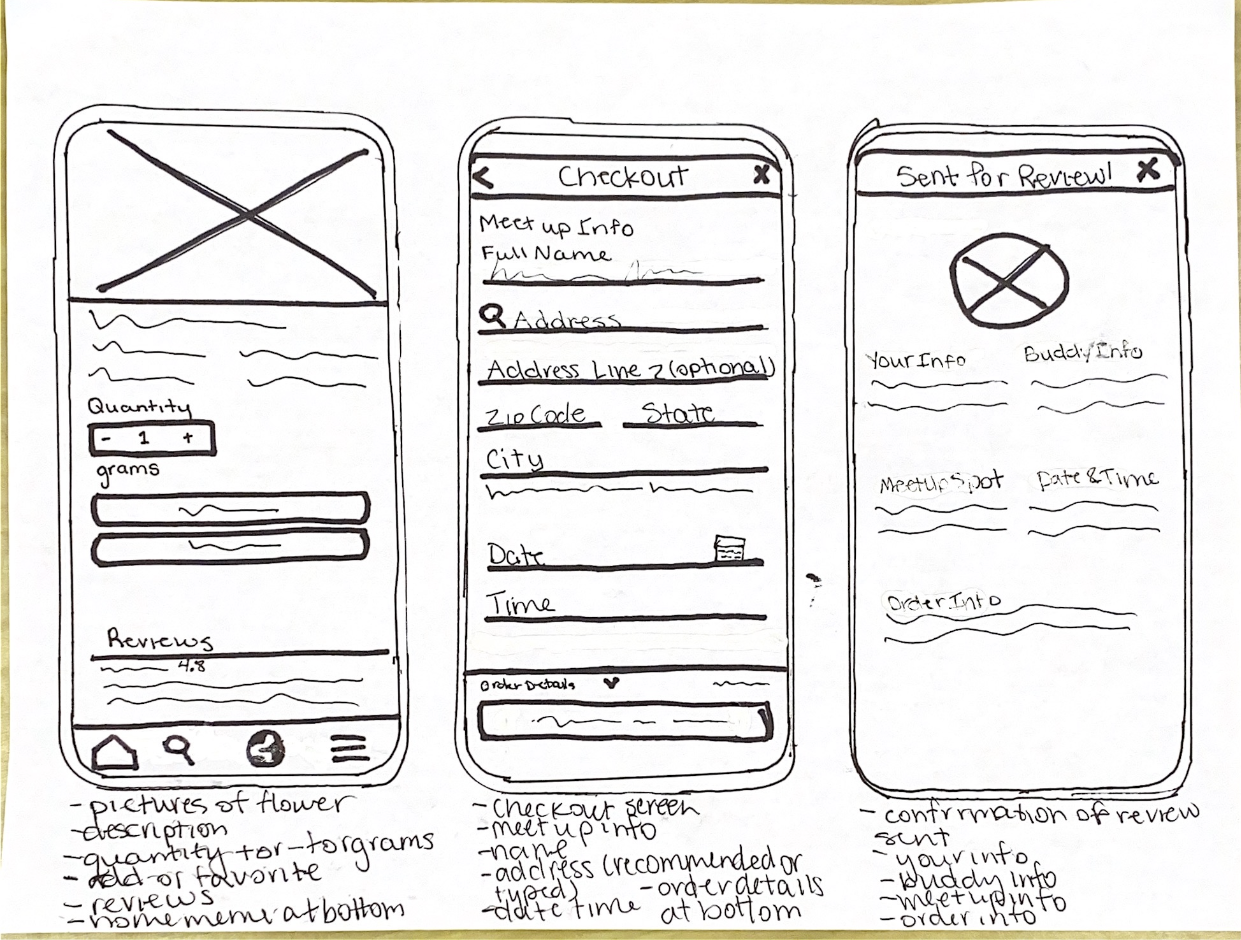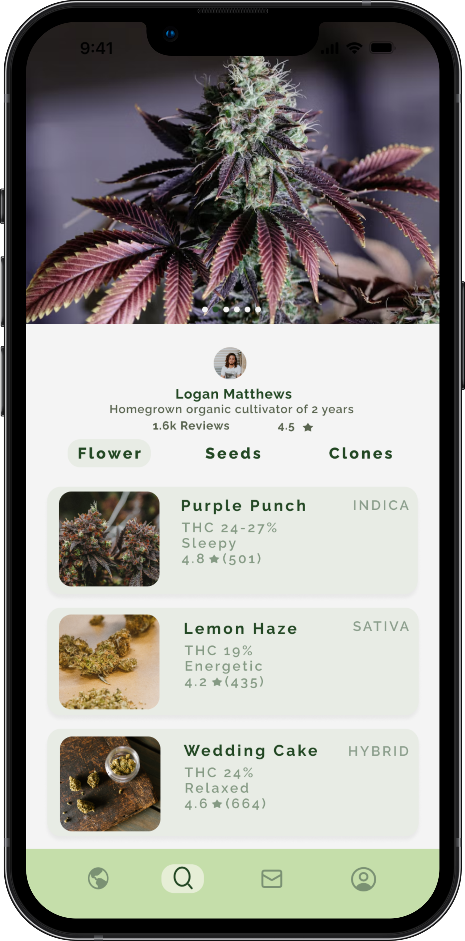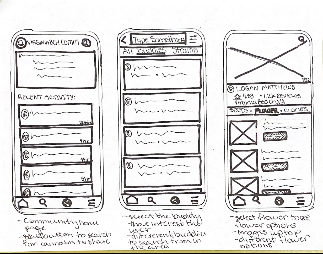 At first, I spent a couple weeks trying to play with three different directions: An educational, social media, or an e-commerce app solution. However, upon thinking about the effects and I realized what users were missing for my final solution. An app that streamlines the cannabis selection process by having all aspects of it in one condensed app. The cannabis sharing app allows users to easily access invaluable information including reviews, recommendations, and ratings from others who have tried the strains from growers in their community. Also, providing an assortment of local growers whom are willing to share their stash.