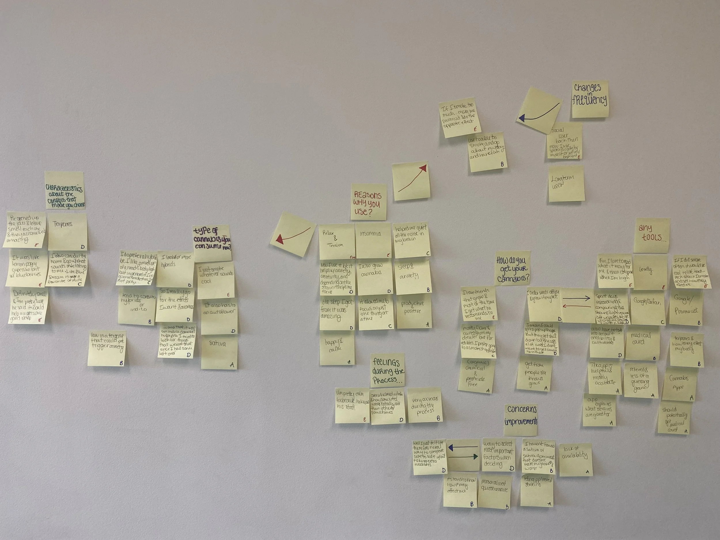 Although I saw from secondary research that having concise information if any was important, I’ve conducted interviews with 6 participants who had different but similar experiences with cannabis strains. I’ve asked them questions below to find trends on why they had negative or stressful experience sourcing cannabis versus others then organized my data through affinity mapping.